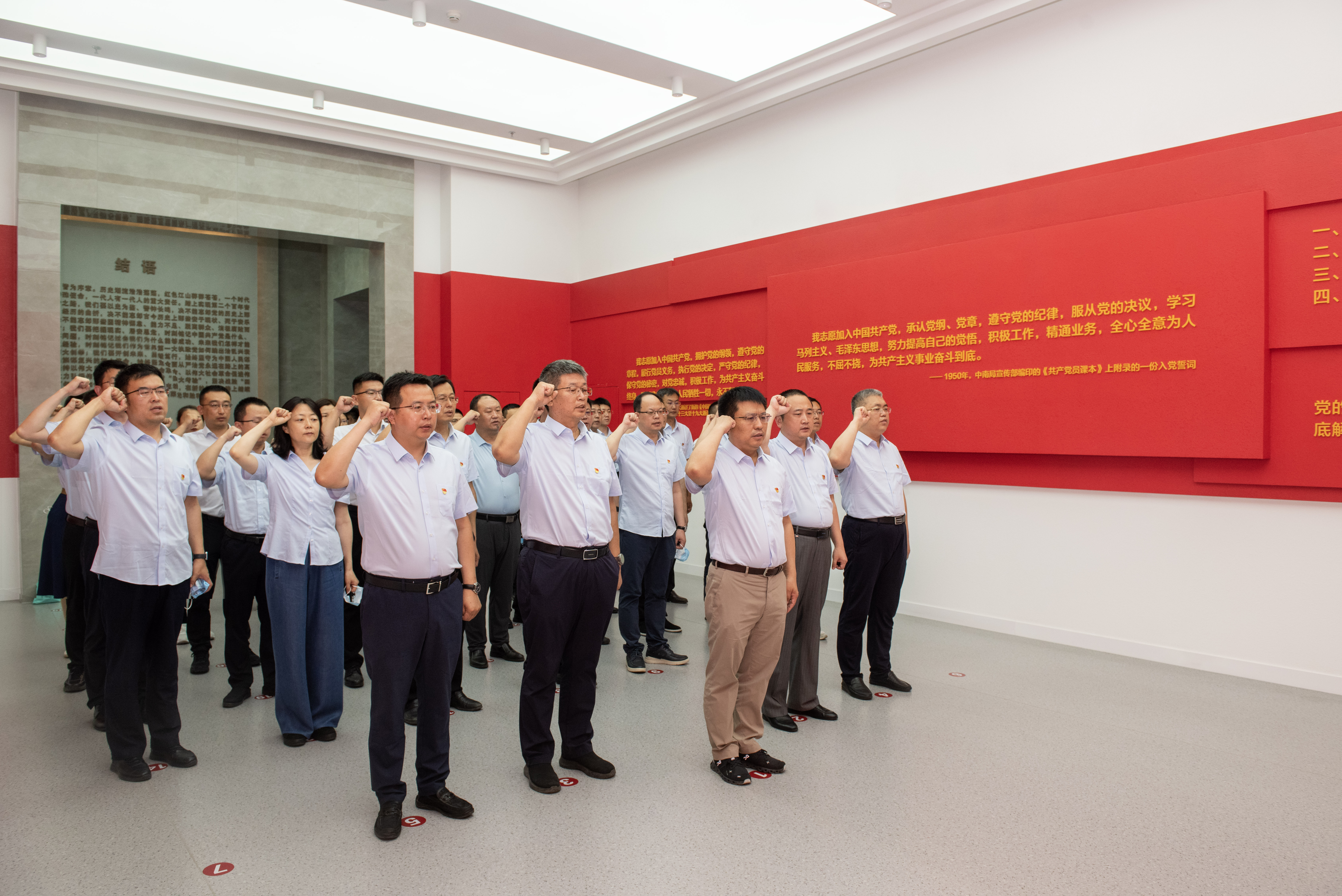 觀摩結束后,參學人員面向黨旗,握緊拳頭,鄭重宣誓,重溫入黨誓詞,銘記初心使命。